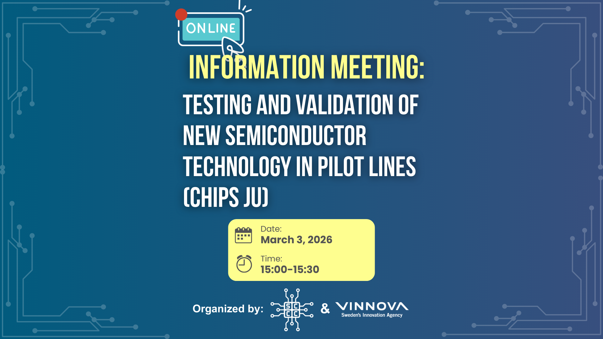 The Swedish Chips Competence Centre (SCCC), together with Vinnova, invites small and medium-sized enterprises (SMEs) to an online information meeting on testing and validation of new semiconductor technology in pilot lines under the Chips Joint Undertaking (Chips JU). This session will introduce the latest call for proposals, explain how project support works, and highlight opportunities to use Europe’s advanced semiconductor pilot lines for prototyping, proof-of-concept, and innovation activities.
