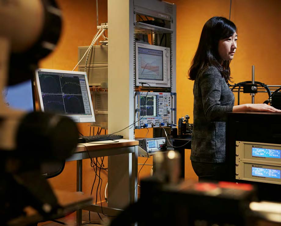 Former PhD student Eunjung Cha uses a cryogenic probe station down to 4 K to characterize low-noise InP transistors on-wafer up to 40 GHz. The results from such device measurements is used to design the cryogenic amplifiers, with state of the art results in noise temperature. Photo: Henrik Sandsjö.